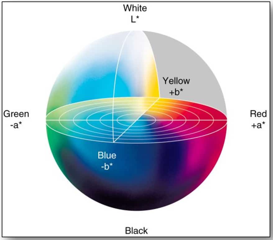 Instead, we use the LAB color space model to describe color. The model is made up of an L* axis from top to bottom representing a high L number for white, and a low L number for black and grays in between. The A* axis describes red (a positive A number) and green (a negative A number) while the B* axis describes yellow (a positive B number) and blue (a negative B number).