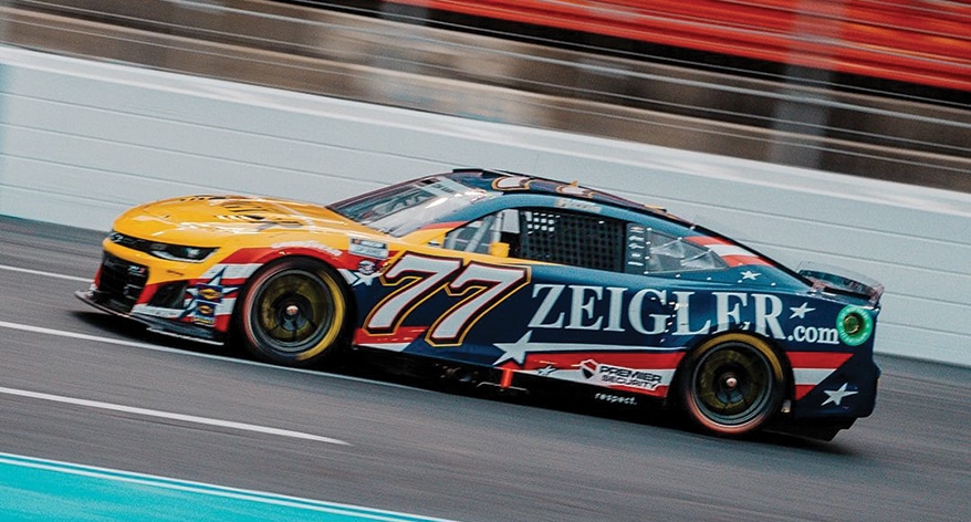 Like everyone else, SPIRE Graphics (Mooresville, NC) has to strictly follow NASCAR’s graphics guidelines as NASCAR has the final say if a layout is good enough to start printing. Having passed, the shop used their MUTOH XpertJet 1641SR Pro Eco Solvent Printer on 3M cast vinyl, protected with premium overcast laminates by their GFP Laminator. “In motorsports every little thing is scrutinized to find an advantage,” says Kevin Wilson, Spire’s president, “so lots of times butt seams are used to maximize aerodynamics … Where there must be seams, they are planned to be as aero-efficient as possible,” he adds.