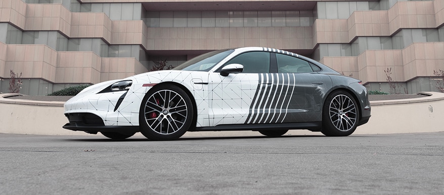 This stylish sports-car graphic was installed by WrapStar Pro (Sacramento, CA) to promote Arlon’s new VITAL Series DPF V9700 premium non-PVC cast polyurethane and Series V3370 Overlaminate. The shop used Adobe Illustrator and CorelDRAW for the client’s design, then its Roland DGA TrueVIS VG3 printer and Royal Sovereign laminator. Little would you know that underneath the wrap for the electric Porsche Taycan, the car is painted baby blue. “Such an odd color for a $150K sports car,” comments Kristin Lanzarone, owner of WrapStar Pro.