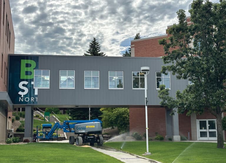 Bismarck Sign Co. (Bismarck, ND) took the call when Bismarck State College, an existing client, contacted them to wrap a skywalk. The college’s marketing team provided the design, while the signshop’s project manager conducted an extensive survey to make sure the window perf would fit perfectly, says co-founder Alexandra Lund.
