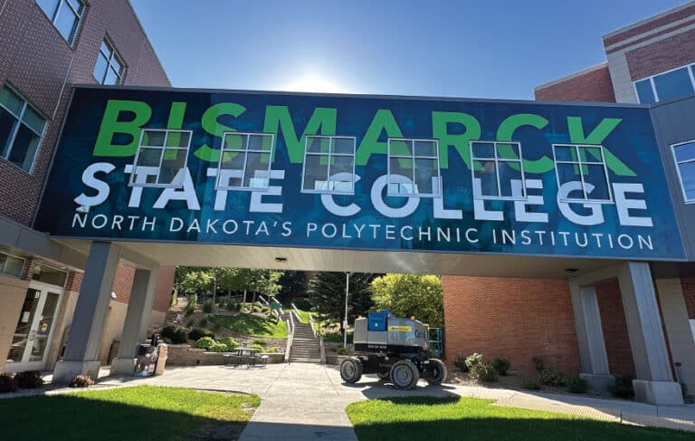 Bismarck Sign Co. (Bismarck, ND) took the call when Bismarck State College, an existing client, contacted them to wrap a skywalk. The college’s marketing team provided the design, while the signshop’s project manager conducted an extensive survey to make sure the window perf would fit perfectly, says co-founder Alexandra Lund.